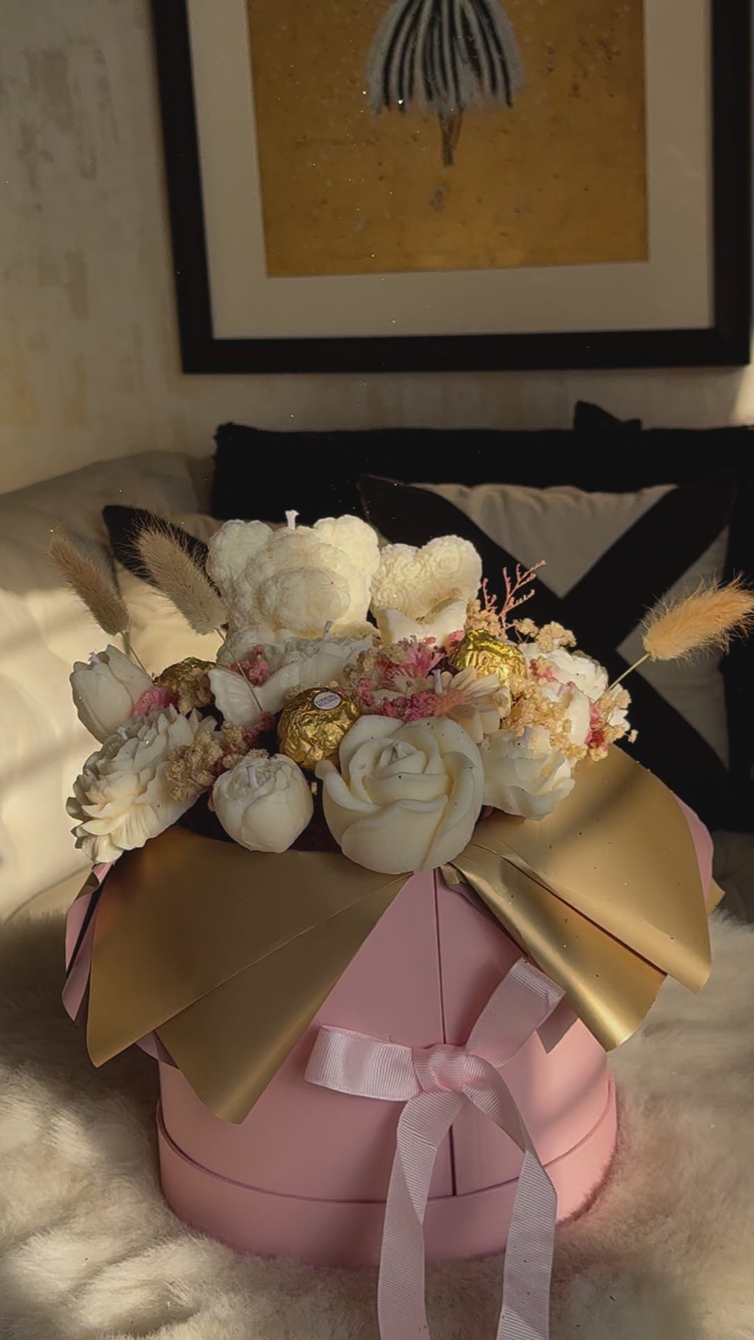 A delicate harmony of soft pinks, creamy whites, and subtle ivory touches—this handcrafted bouquet features 14 elegant white candles in charming shapes, including roses, hearts, and a cuddly teddy bear centrepiece. Nestled among preserved florals and gold accents, it’s a sweet statement of softness and style.