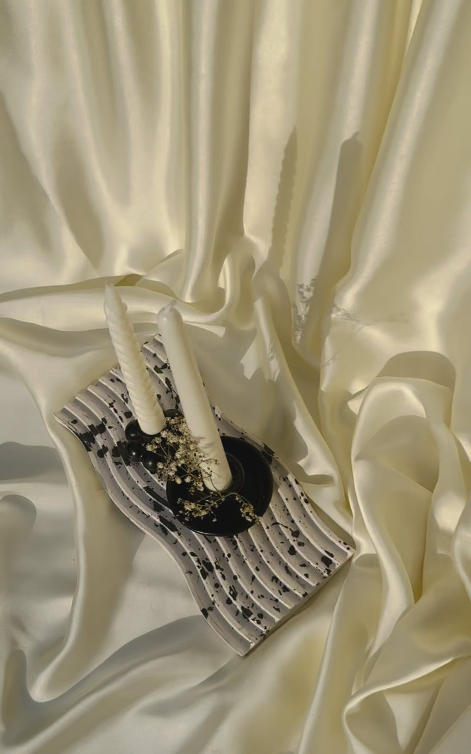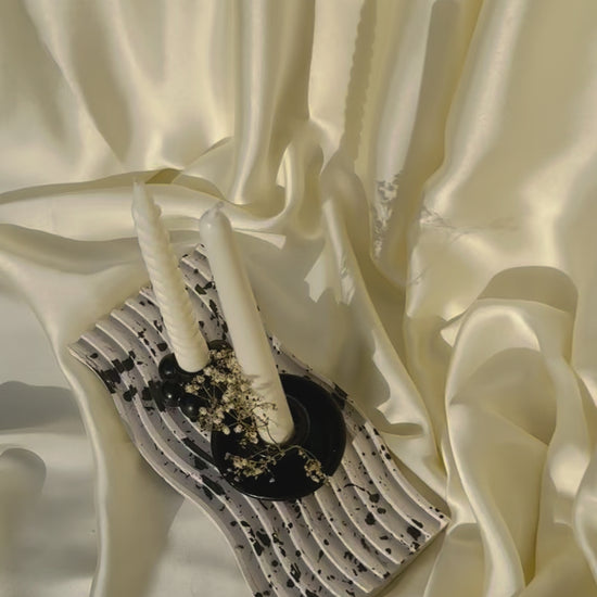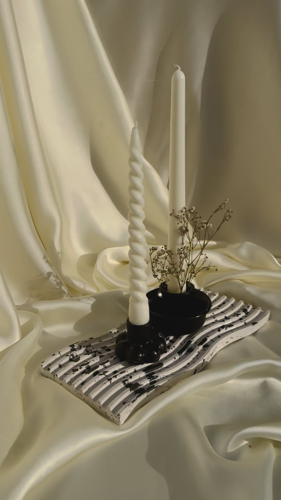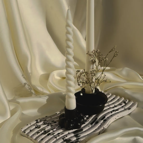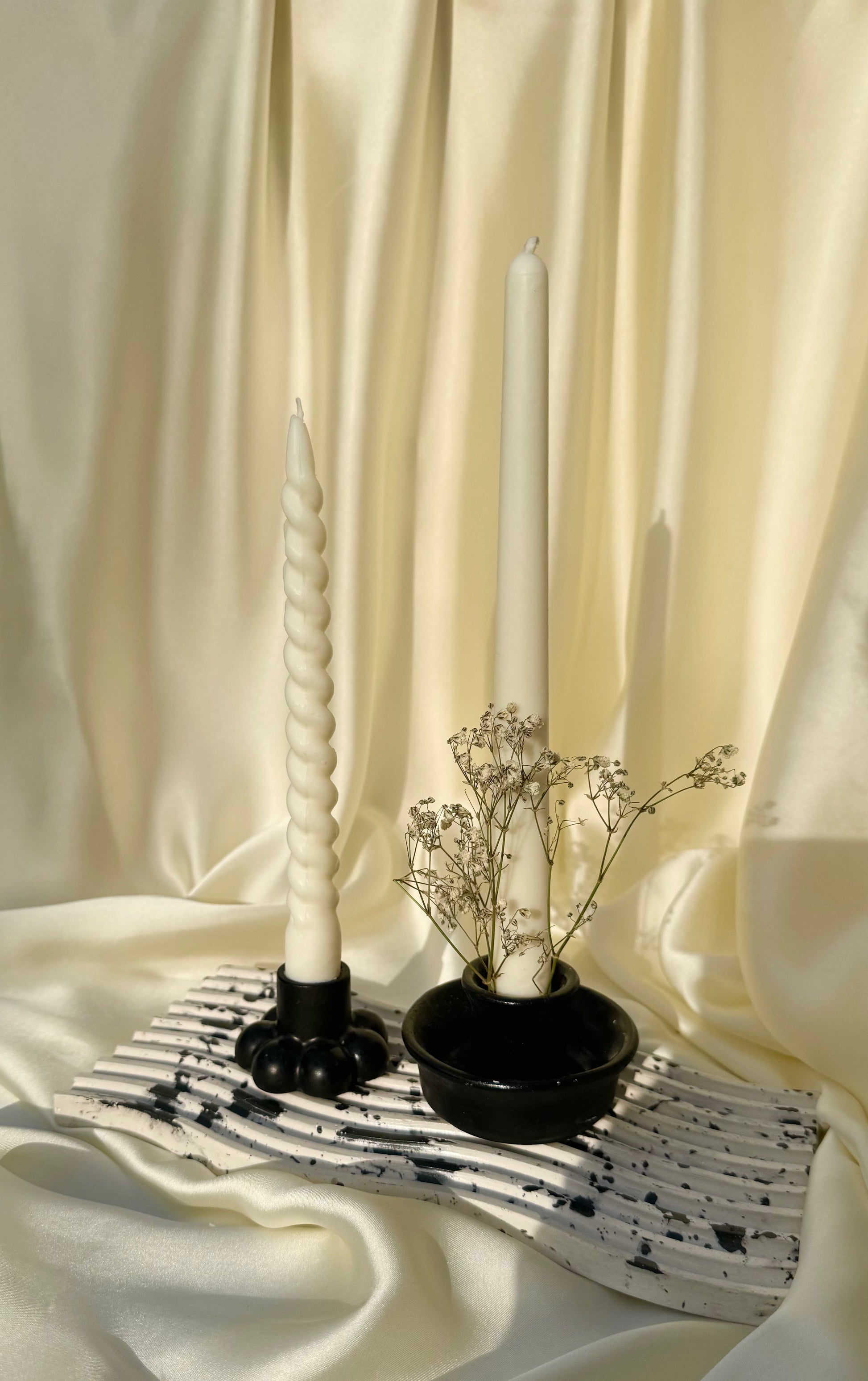 A masterfully curated still life, showcasing a sublime arrangement of elegant elements on a luxurious marble-toned wavy gypsum tray. The pièce de résistance is the harmonious union of two exquisite candle holders: a sleek black bubble candle holder and a refined black cup candle holder, elegantly adorned with delicate dried baby's breath flowers. The bubble candle holder cradles a majestic white spiral candle, while a slender white taper candle stands sentinel beside it.